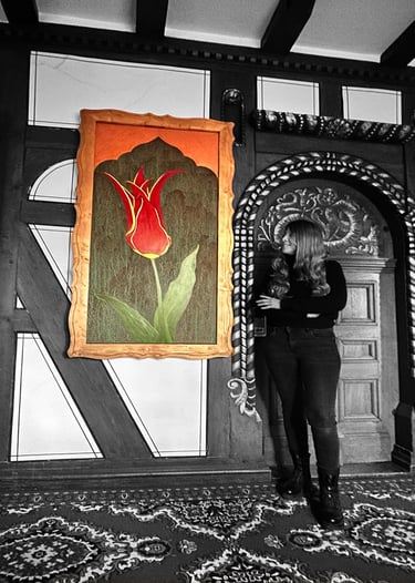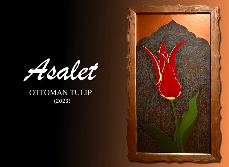 „Die prächtige Tulpe, ein Symbol des Osmanischen Reichs, erhebt sich majestätisch vor einem Hintergrund, der durch die kunstvolle Mocca-Technik in seiner ganzen Tiefe erstrahlt. Ein einzigartiges Zusammenspiel von Geschichte und künstlerischem Ausdruck.“