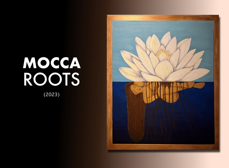 Sinnbild für Reinheit und Neubeginn, zeigt das Gemälde eine junge Frau unter der Wasserlilie. Ihr Haar, aus fließendem Mocca, erstreckt sich wie Wurzeln bis zum Grund des Wassers und verbindet die Elemente. Ein Werk, das Reinheit, Wachstum und den Zyklus des Lebens vereint.